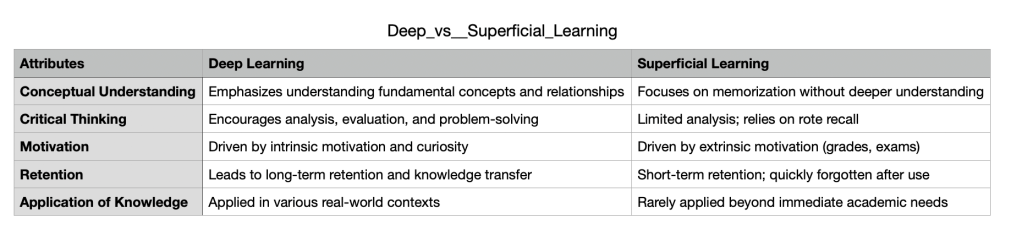 While superficial learning may serve short-term academic goals, deep learning fosters lifelong critical thinking, adaptability, and meaningful application of knowledge. Rote memorization of words lists is ineffective for long-term retention as it belongs to the realm of superficial learning.