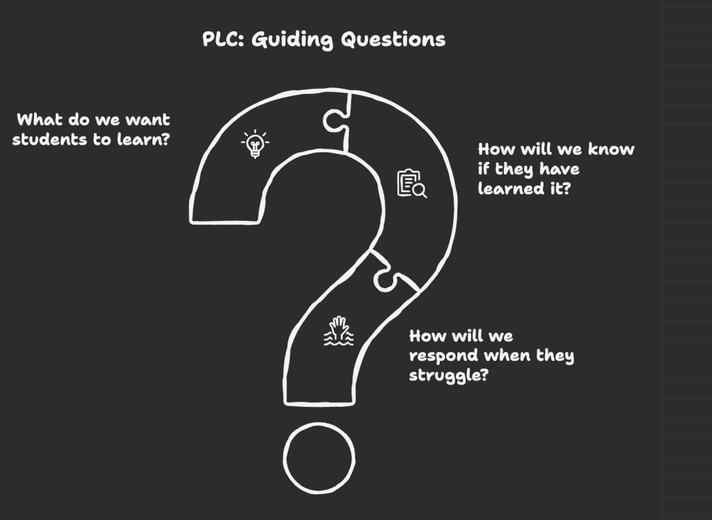 Recently, a teacher from another school mentioned that their team had begun using the Professional Learning Community (PLC) framework and consistently referred to “the guiding questions.” That comment made me pause. I had heard the term PLC many times before, but I realized that I had never really stopped to ask what it actually meant in practice.